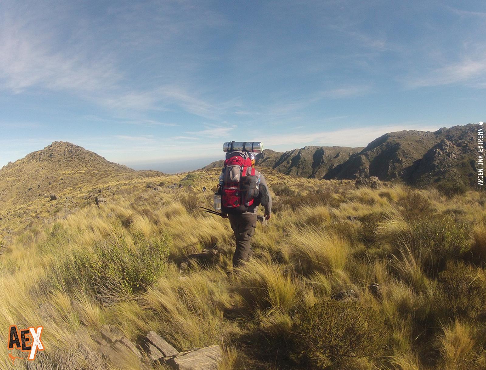 Día 2: Continuamos hacia el oeste. Entre valles, cuestas y arroyos avanzamos por las sierras de San Luis. Nuestro rumbo continúa al oeste por una ladera de pendiente muy suave, cubierta por pastos verdes y salpicados por rocas grises hasta alcanzar el filo, punto más alto de la travesía (2000msnm.). Tenemos posibilidades de avistar cóndores y si la visibilidad es óptima puede verse en la Cordillera de Los Andes como sobresale el majestuoso “Aconcagua”. Antes de que caiga el sol, iniciamos la primera parte del descenso por una quebrada angosta hasta llegar al Río de La Quebrada, donde buscamos un viejo puesto para acampar (1300msnm.) al pie de un mogote de rocas. Jornada intensa, 8 hs. de caminata.